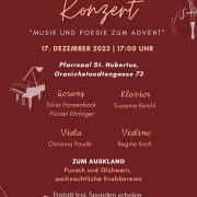 Am letzten Adventsonntag ging unser jährliches Konzert über die „Bühne“ des Pfarrsaals. Ein voller Saal lauschte gespannt den musikalischen Darbietungen und poetischen Einwürfen. Regine Koch an der Geige, Christine Pawlik an der Bratsche und Susanne Reichl am Klavier boten ein kompetentes Trio, aber auch barocke Duos der Streichinstrumente mit Klavier passten gut zur Stimmung. Duette und Sololieder, gekonnt dargeboten von Silvia Panzenböck und Florian Ehrlinger schufen gesangliche Abwechslung zu den instrumentalen Werken. Poesie zum Advent und manch Wissenswertes z.B. über die Geschichte der Kerzen und über berühmte Gemälde zum Thema Verkündigung wusste Susanne Reichl interessant vorzutragen.